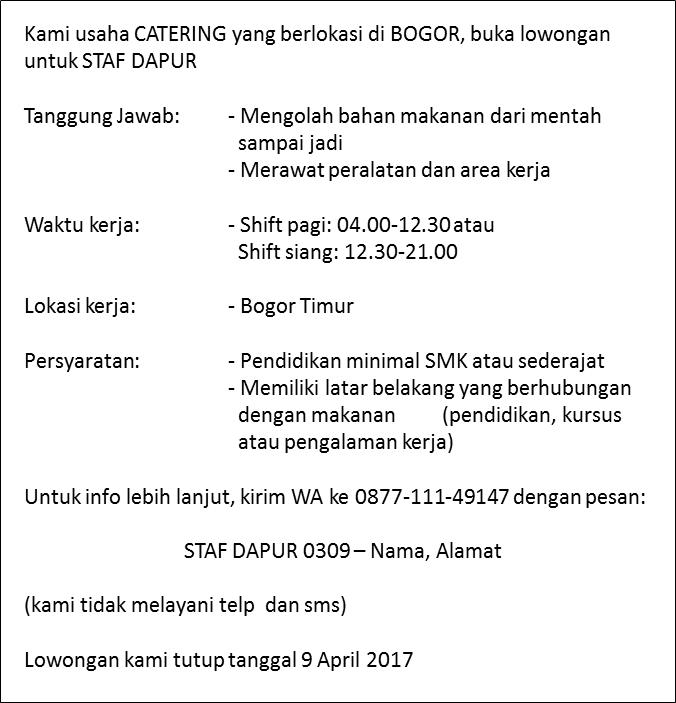 - Bersedia ditempatkan di cabang Kebon Pedes – Bogor